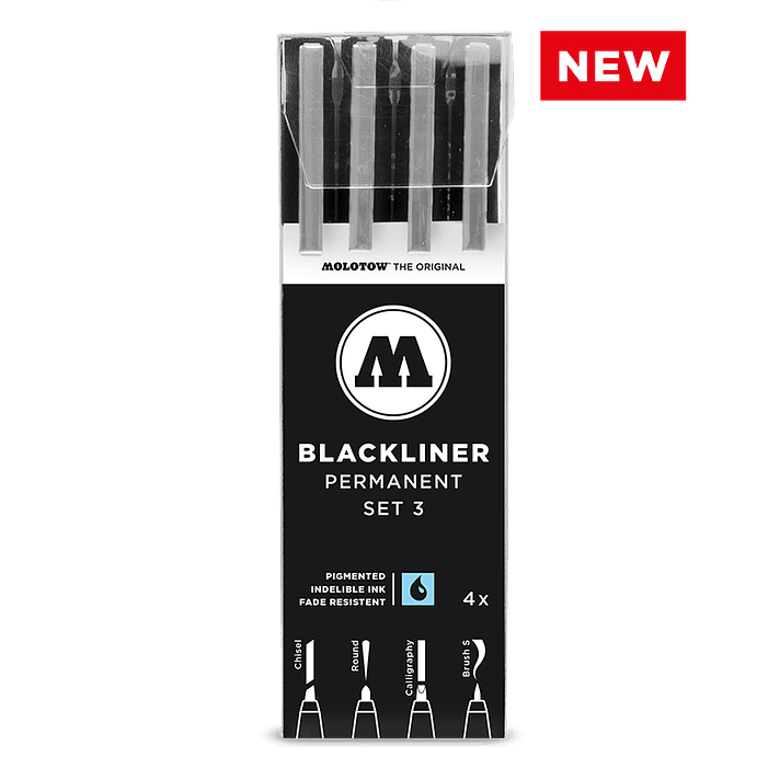 El BLACKLINER SET 3 contiene 4 marcadores con los consejos especiales Cincel, Redondo, Caligrafía y Pincel S. Es ideal para manipulaciones, caligrafía, así como dibujos cómicos expresivos y contornos en bocetos de graffiti. Con este conjunto tienes todo bajo control.