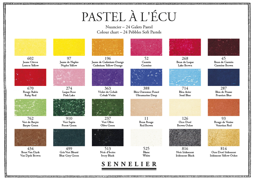 La composición de alta calidad de los pasteles "à l’écu" es el resultado de un equilibrio perfecto entre el aglutinante y el pigmento. Para los tonos degradados, se agregan cantidades crecientes de finos minerales, que en última instancia tienden hacia el blanco. El brillo excepcional es el resultado del pigmento y de los finos minerales naturales descubiertos por Sennelier en 1905 y que se han utilizado desde entonces.